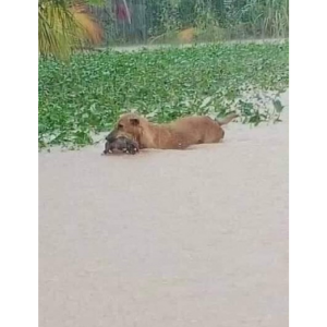 Shouts echoed in panic, quickly swallowed by the roar of the flood. The mother dog fought the current with everything she had, paddling through the chaos as the water slammed against her body. Again and again, the river tried to pull her under—but she refused to stop.