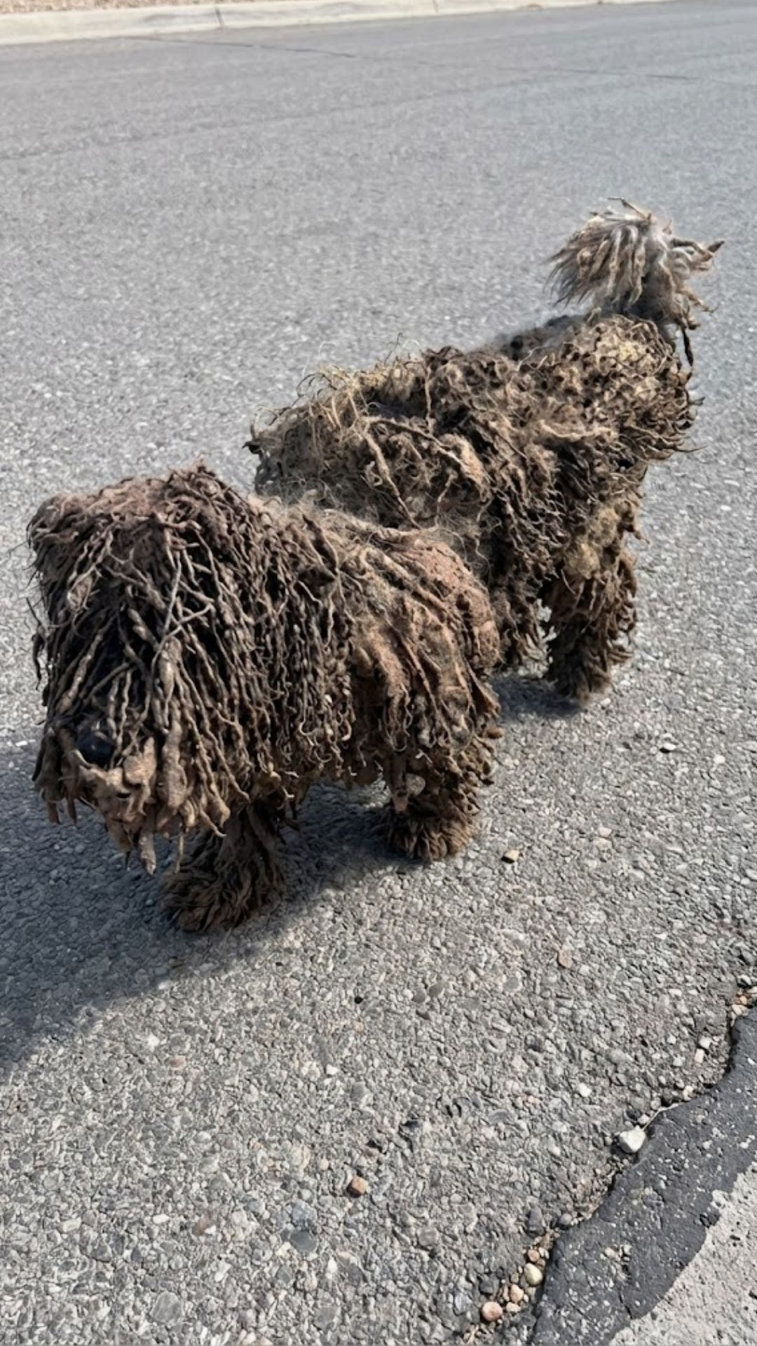 Her fur was so tightly matted that it had formed heavy clumps all over her body. Dirt had hardened into the tangled coat, making it nearly impossible to see her true shape.
