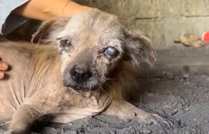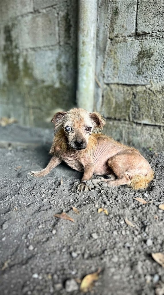 When rescuers finally arrived, they were devastated. The dog barely looked alive. Most of his fur had fallen out, leaving behind angry, scaly skin that must have burned and itched constantly. His eyes were cloudy and distant, as if he could no longer see the world around him—only the darkness he felt inside.