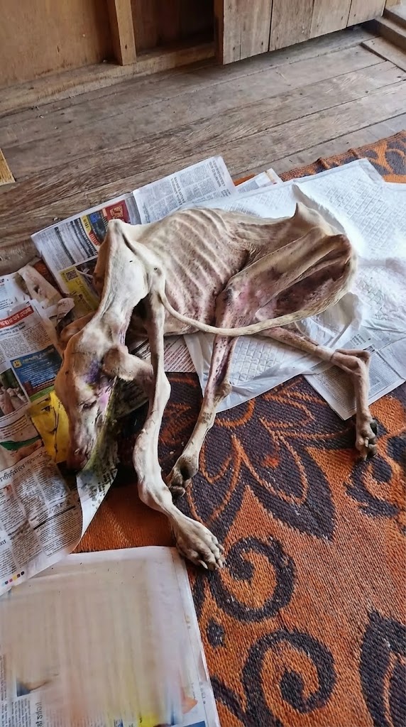 When a passerby finally pulled over, the reality of Diana’s condition was impossible to ignore. She was painfully thin, her ribs visible beneath damaged skin that told a long story of neglect.