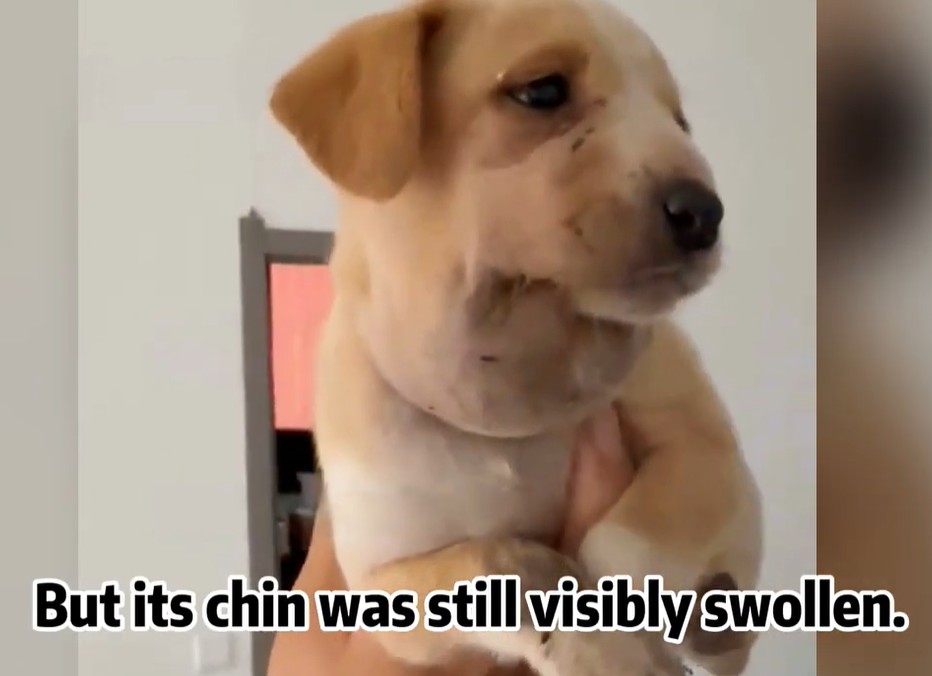 By the second day, the “balloon” swelling began to shrink, though the puppy’s chin was still painfully inflamed. But little by little, the puppy’s spirit returned. It started walking around again, cautiously exploring its surroundings like it couldn’t believe it was allowed to exist without fear.