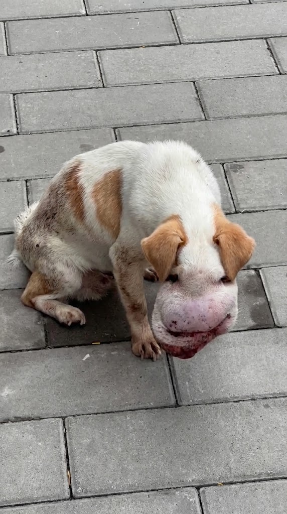 A massive, frightening tumor hung from his chin, dragging his jaw down until it looked almost… gone. He was barely a dog anymore — just a fading shadow, a “dying dog” waiting for the kind of mercy the world too often forgets.
