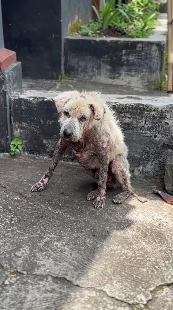 That day, we were driving along a quiet road when we noticed a lonely figure ahead. At first, he looked like just another stray: thin, slow-moving, and barely holding himself together. A shadow of a dog, wandering with no destination.