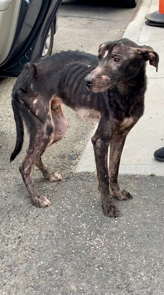 What they saw was a figure so thin it looked unreal — a skeleton wrapped in dirty, matted fur. He lay inside a small, broken cart, buried under a few worn-out blankets, barely moving. Weeks… maybe months… of hunger had stripped him down to almost nothing.