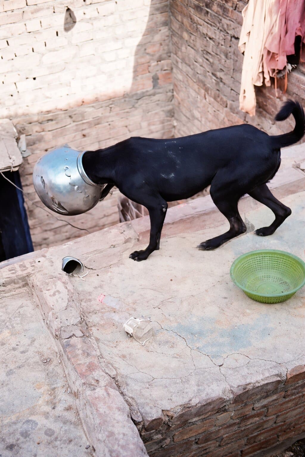 The dog now resembled a clumsy superhero wandering around with an oversized stainless-steel helmet, the pot echoing loudly with every step he took.