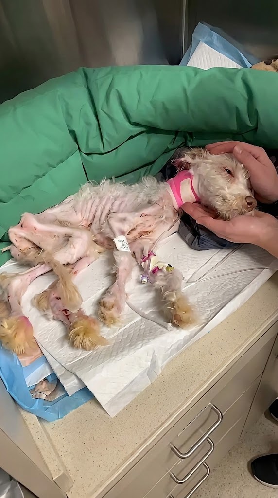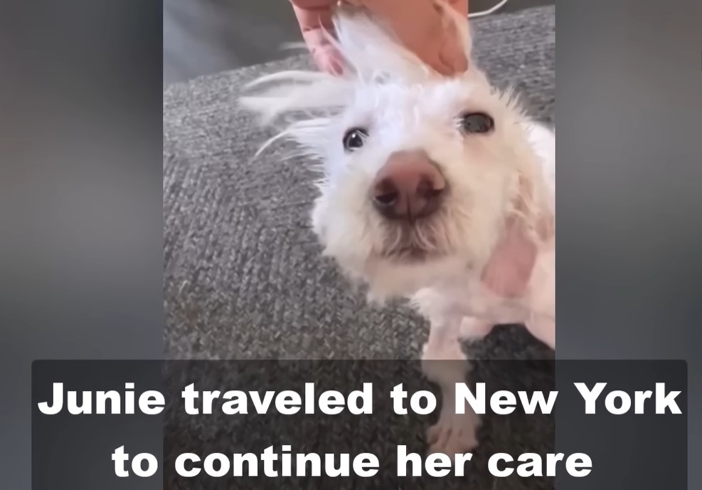 When rescuers arrived at a barren field, they found a filthy plastic crate abandoned in the open. Inside it lay Junie—a tiny dog who looked less like a living creature and more like something already lost.