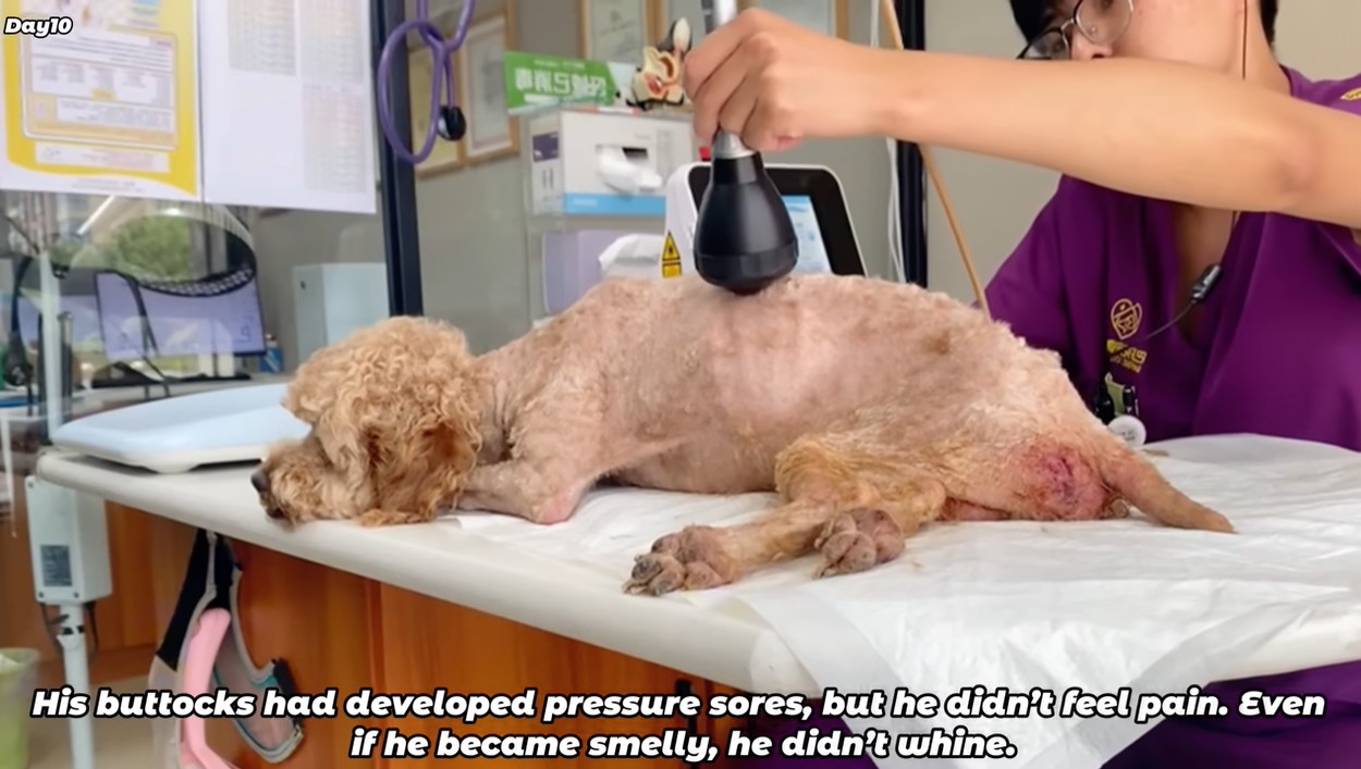 On Day 10, a deeper exam revealed severe nerve compression. His hips and rear were already scraped raw from dragging himself, forming painful pressure sores—often called the “chronic cancer” of paralyzed animals.