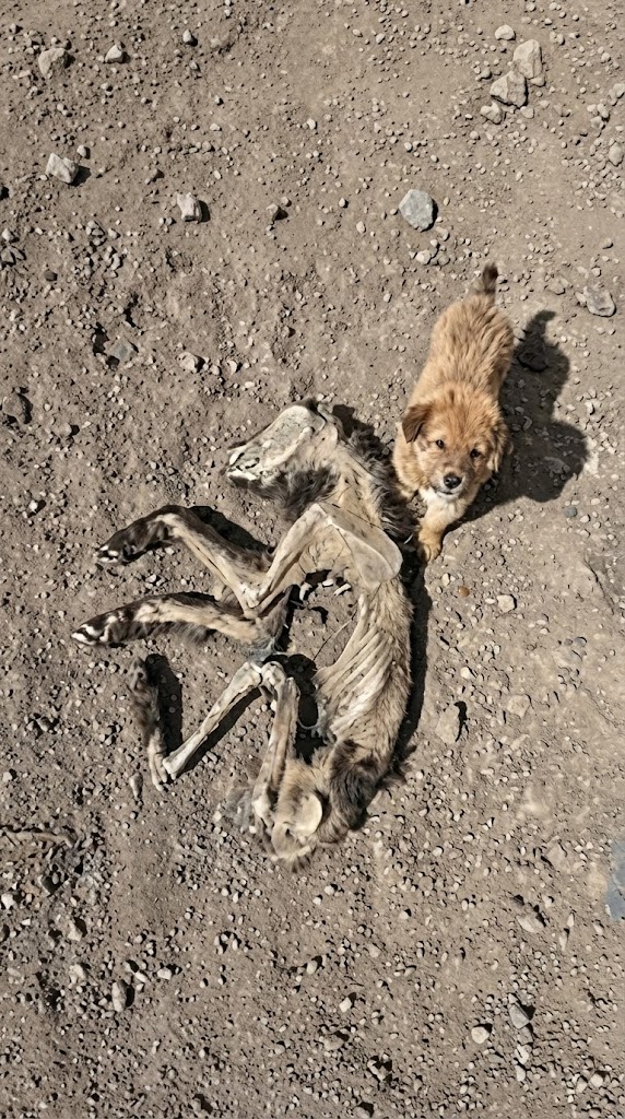 In the center of the image sat a small puppy with yellow-brown fur, its body tucked close to what looked like the skeletal remains of a larger dog. The bones were pale, weathered by time and exposure, with only faint traces of fur left behind. The scene was raw, but not shocking. There was no visible violence, no suggestion of chaos—only quiet aftermath.