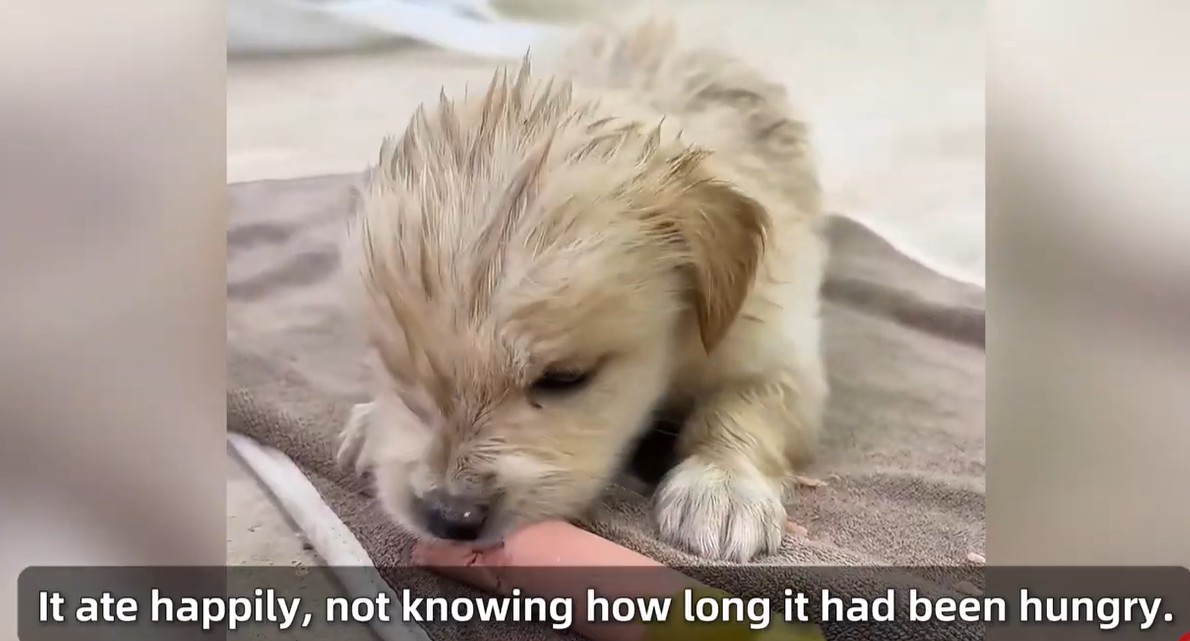 The uncle dried the puppy as best he could, then stopped by a supermarket on the way home. With no carrier and no time to waste, he gently placed the little pup inside an eco-bag like it was a warm nest. He also grabbed sausages—because one look at that skinny body made it obvious the puppy hadn’t eaten properly in a long time.
