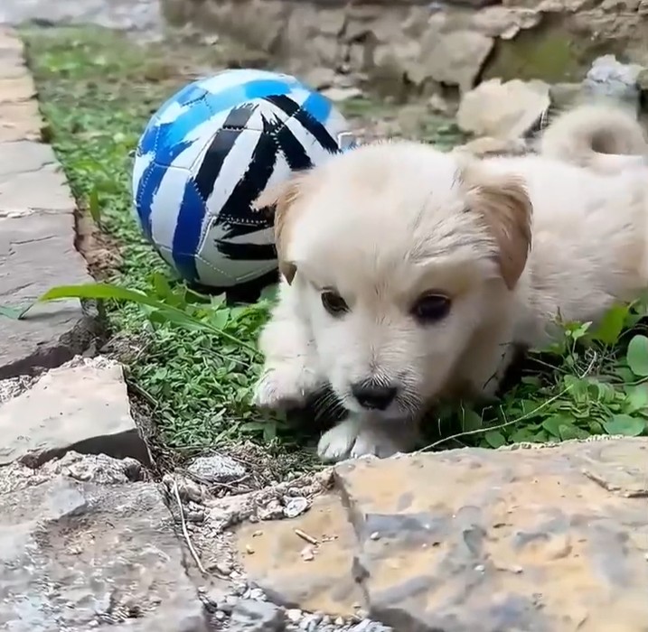 To help with anxiety, the uncle bought him a ball—so big it looked ridiculous next to the puppy’s tiny body.