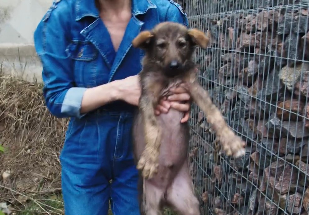 The puppy was almost entirely hairless. His skin looked raw, thickened, and painfully irritated—like it had been burning for weeks. His back carried the signs of an older injury, and the way he held himself made him look… defeated.