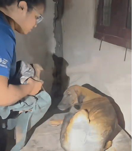 The borewell was long and narrow, leaving no room for a person to climb down. When rescuers shone flashlights inside, they spotted the puppies wedged against the damp inner wall, their small bodies smeared with mud.