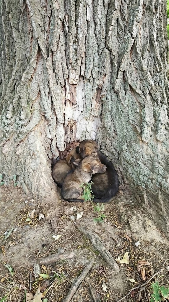 Hidden beneath an aging tree, far from the road and swallowed by tall grass, three newborn puppies lay tangled together. They were impossibly small. Their eyes barely open. Their legs useless beneath them.
