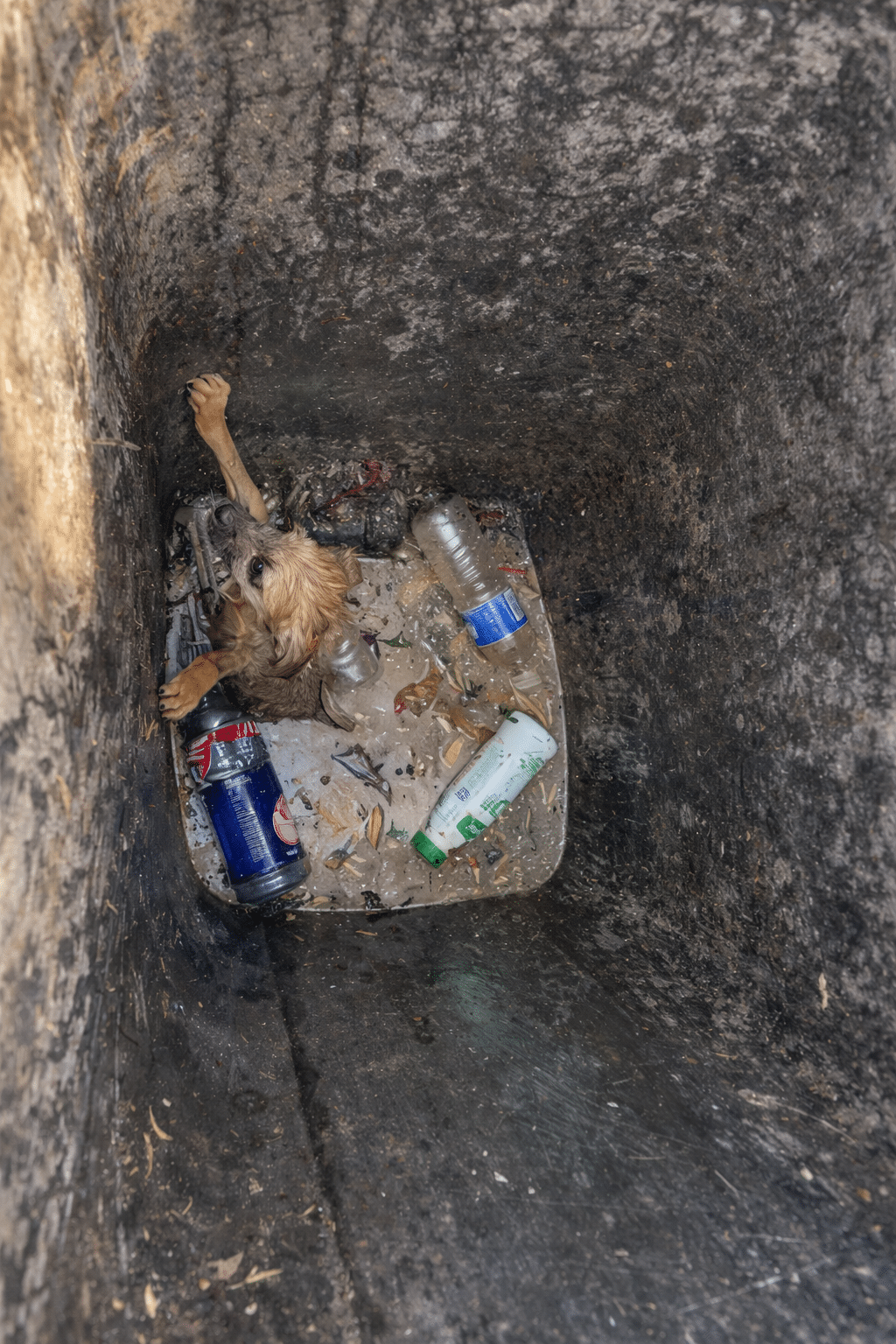 He was painfully thin. His legs looked brittle, like they could snap under his own weight. And yet his belly was swollen, an unsettling contrast to the rest of his starved frame.