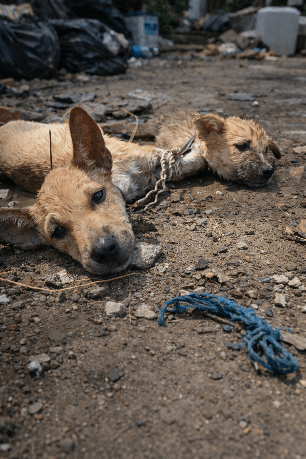 They were painfully thin. Their fur was clumped with mud and grime. A short chain held them together, forcing them to move as one — even when they tried to shift their tiny bodies.