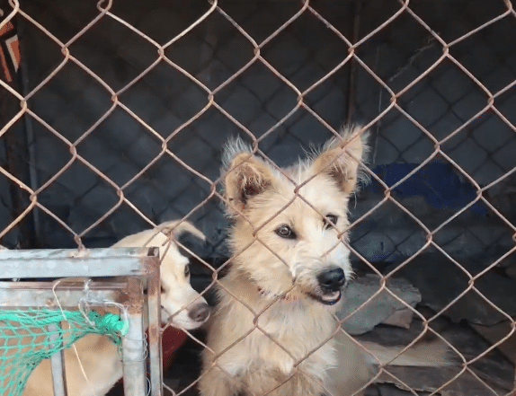 In one small cage, two puppies were pressed tightly against each other.
