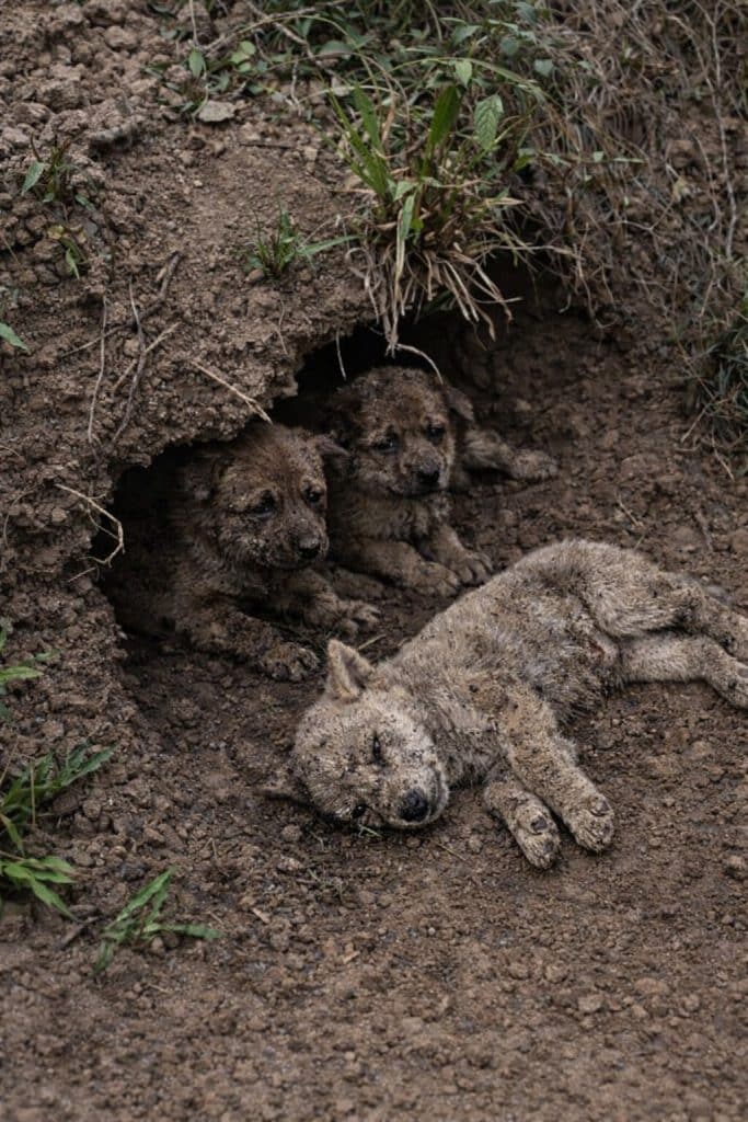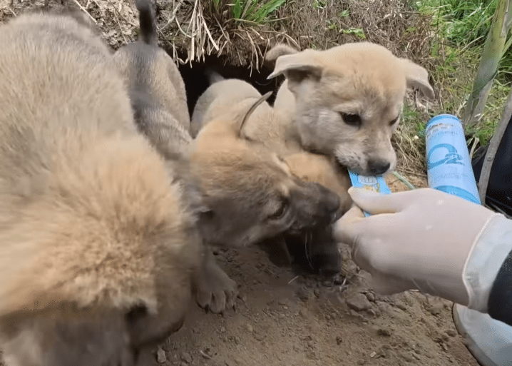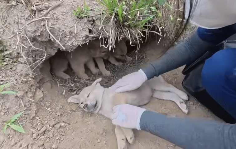 Inside a shallow hollow in the dirt, a small group of puppies had been quietly surviving.