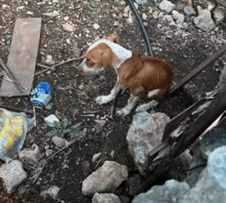 A tiny brown-and-white puppy, trembling, skeletal, and exhausted.