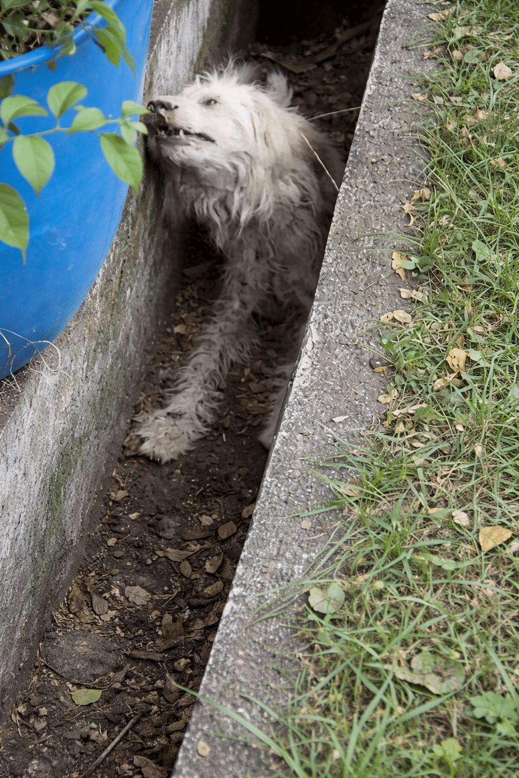 Moments later, still weak and disoriented, the little dog accidentally slips into a narrow concrete drainage channel running beside the grass.