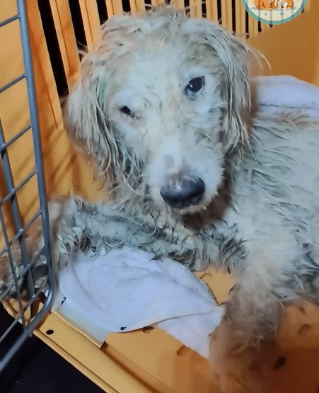 Using a soft towel, he gently wiped away the mud and dirty water clinging to the dog’s fur.