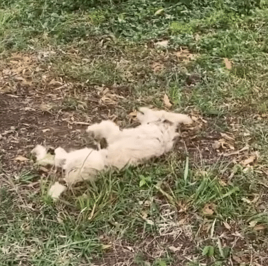 The video opens on a quiet patch of grass where a small white dog is wandering slowly.