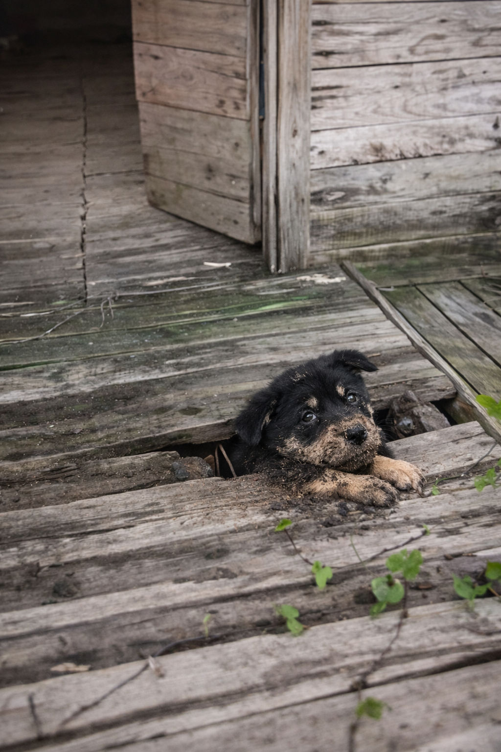 A tiny black puppy was wedged beneath the porch floorboards, his small body trapped tightly between two wooden planks.