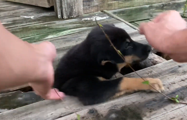 With careful hands, the man gently eased the puppy’s body free from the tight wooden gap.