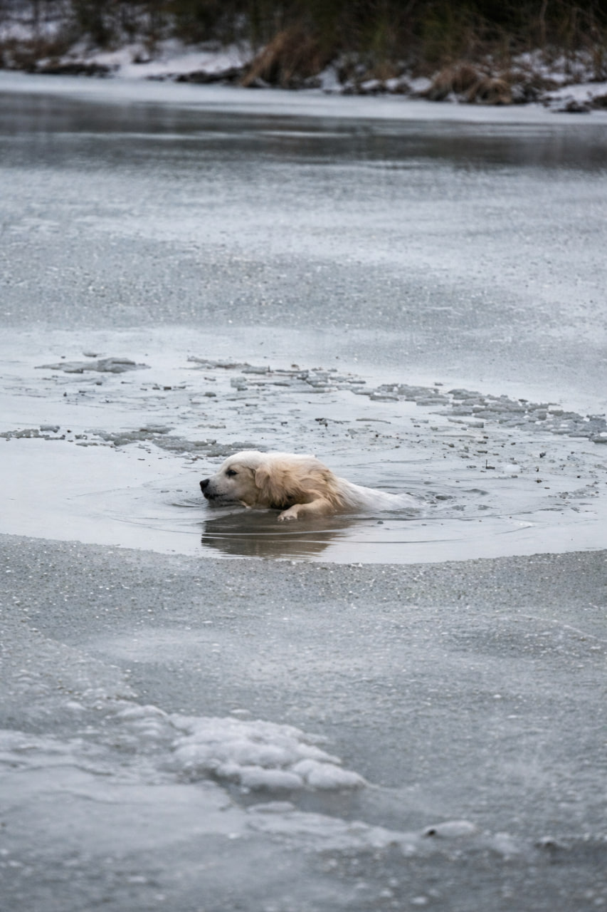 A small puppy is trapped in a pocket of open water, surrounded by ice. His legs paddle frantically, but every second looks heavier than the last. The cold is winning. His cries echo across the lake—thin, desperate, and fading.