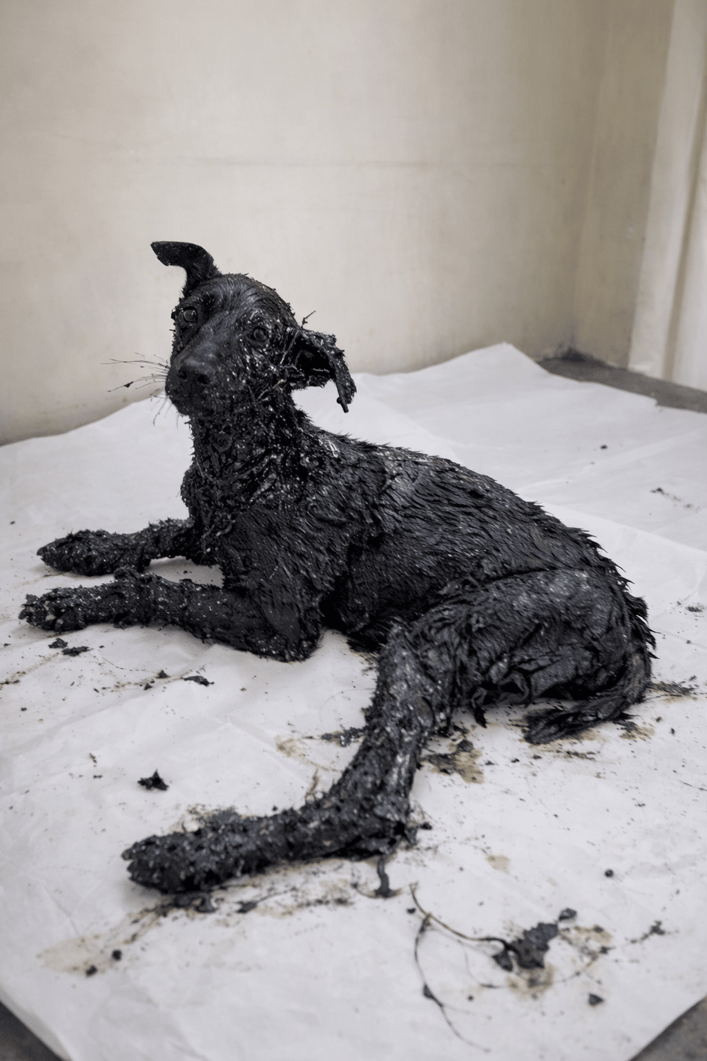 The heavy black coating hardened around him, turning his tiny body into something almost unrecognizable—exhausted, vulnerable, and silently begging for help.