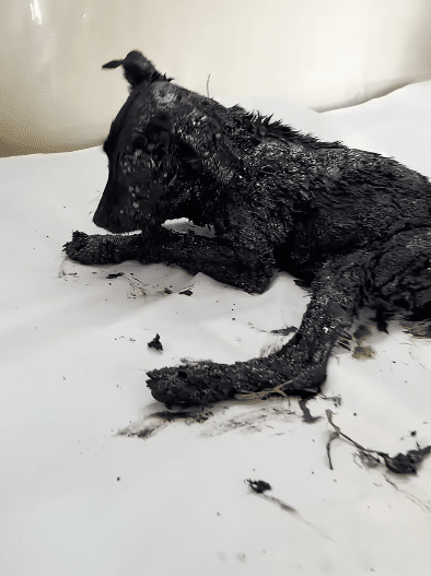 In the final moments of his story, the puppy is clean, alert, and affectionate. The heavy black coating is gone. His eyes are bright again. He leans into the touch of the people who saved him.