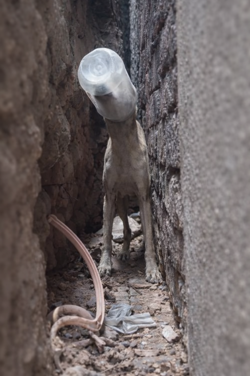 A container that once held food still carries a smell. A hungry dog follows that scent, pushes his head inside… and sometimes, it’s over.