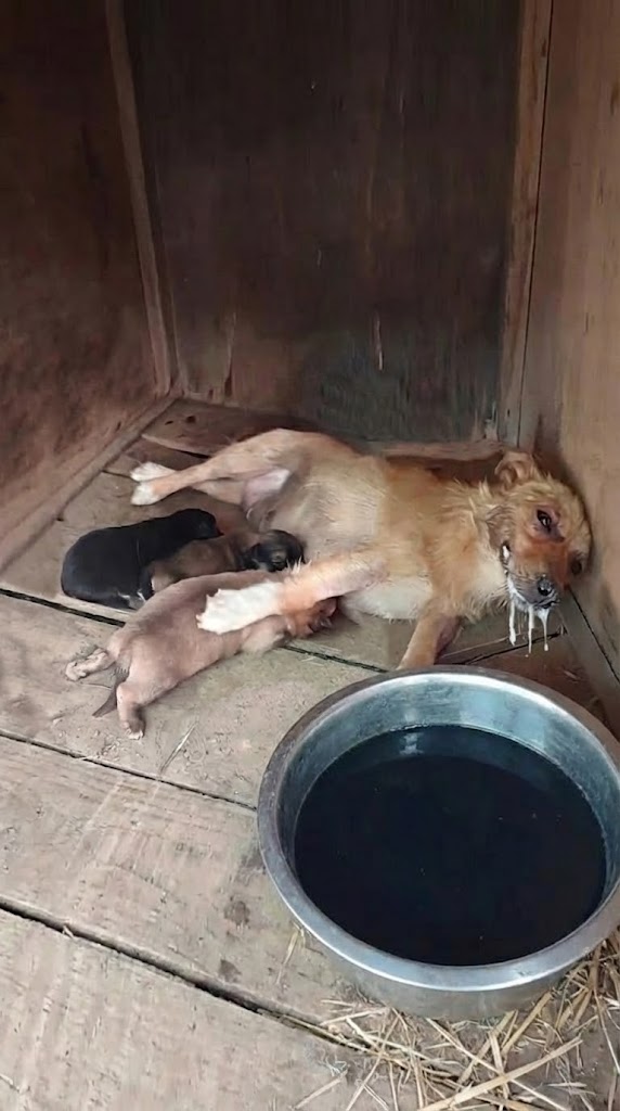 Beneath the corroded shell of abandoned machinery, exposed to cold ground and biting air, a fragile mother dog gave birth to six tiny puppies. There was no shelter. No warmth. No safety. Only her instinct — and her determination to protect the lives she had just brought into the world.
