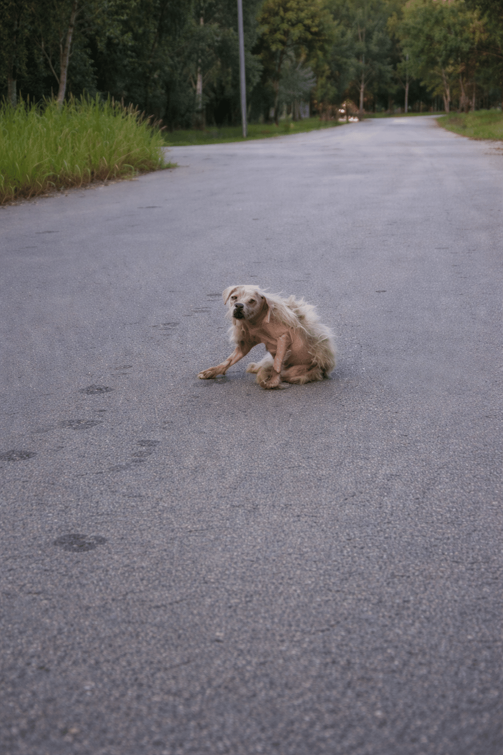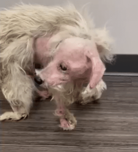 Irritated skin. Tangled, neglected fur. Every step looked like it took effort.