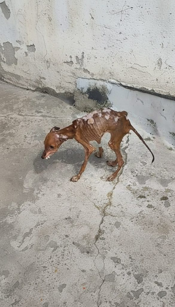 Mangito was discovered lying motionless in a forgotten corner of the world. His body was so depleted that movement no longer seemed necessary. He didn’t cry out. He didn’t look for food. Hunger had carved deep lines into his frame, and neglect had turned his skin into a record of long-term suffering. His eyes carried the weight of an animal who had survived for too long with nothing left to hope for.