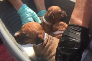 As the flood reached a critical level, they spotted Abilene and her puppies clinging to life. Without hesitation, they waded in and carried the small family out of the water. It was a rescue just in time—but the danger wasn’t over yet.